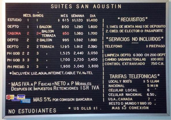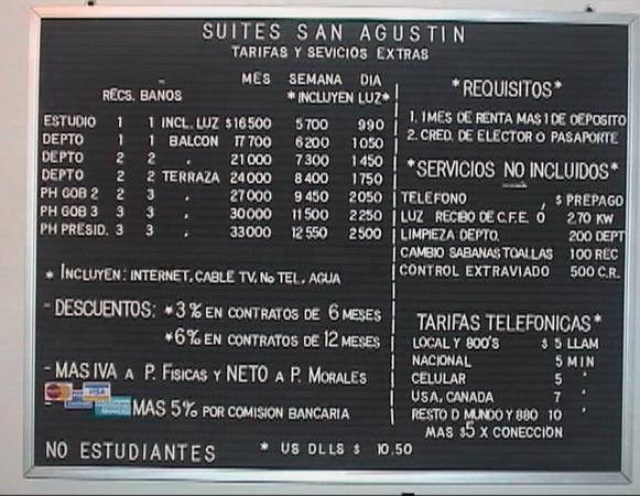 | Todas nuestras TARIFAS son DIARIAS e INCLUYEN: Luz, Agua, WiFi, Cable, uso dealberca, gym, lavadoras y secadoras. Todas las rentas deben ser pagadas por ANTICIPADO mas GARANTIA de 1 dia, semana, mes o Baucher abierto mas ID oficial |